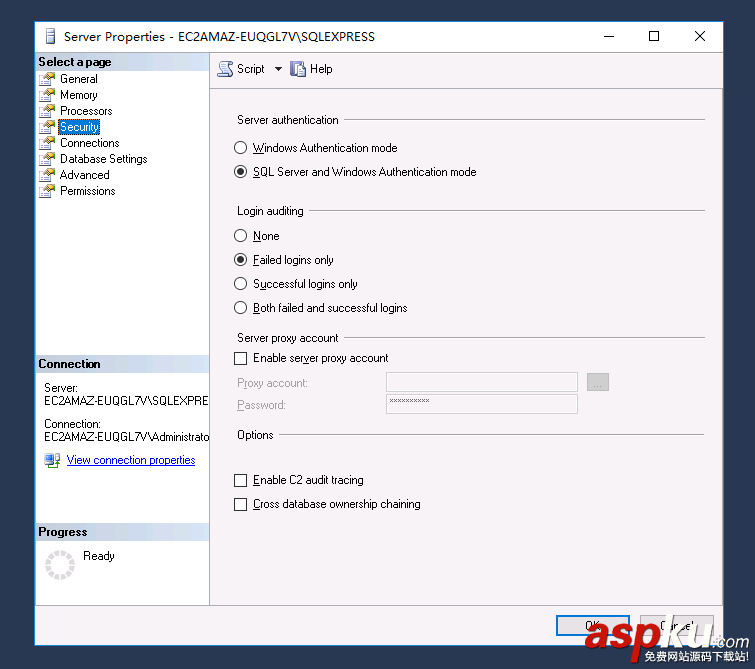 2、右鍵點擊打開的連接,選擇 屬性 (Properties),選擇 安全 (Security),然后設置為 SQL Server 和 Windows 身份驗證模式 (SQL Server and Windows Authentication mode)。