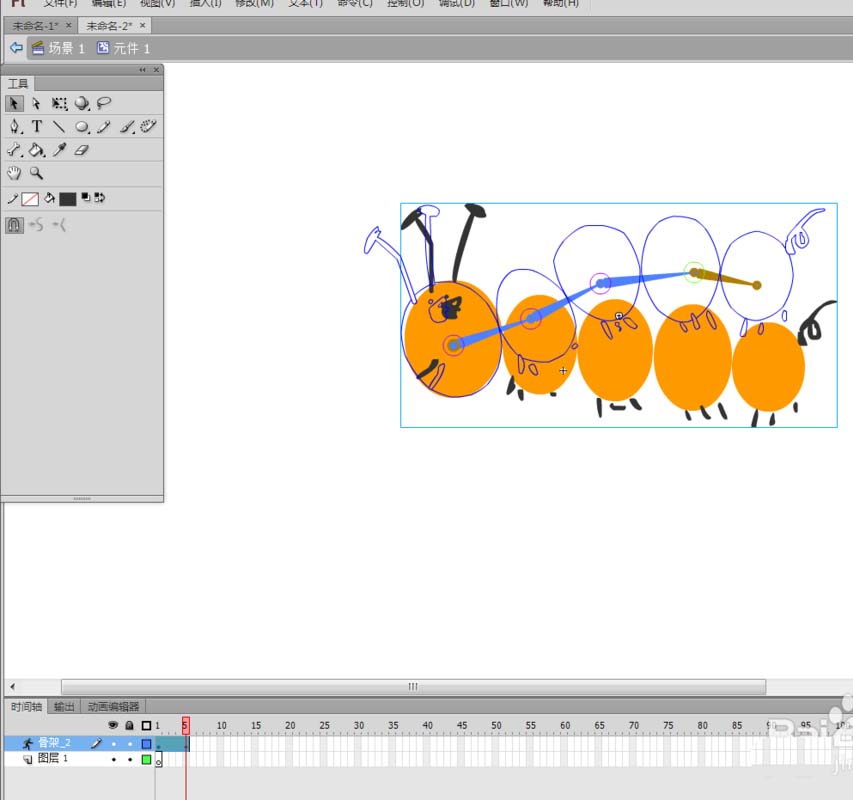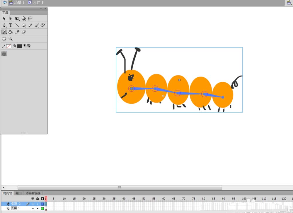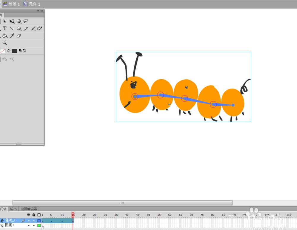 毛毛蟲在運動,用flash做出來,這是很簡單的,這需要用到一個叫做“骨骼工具”的工具了。