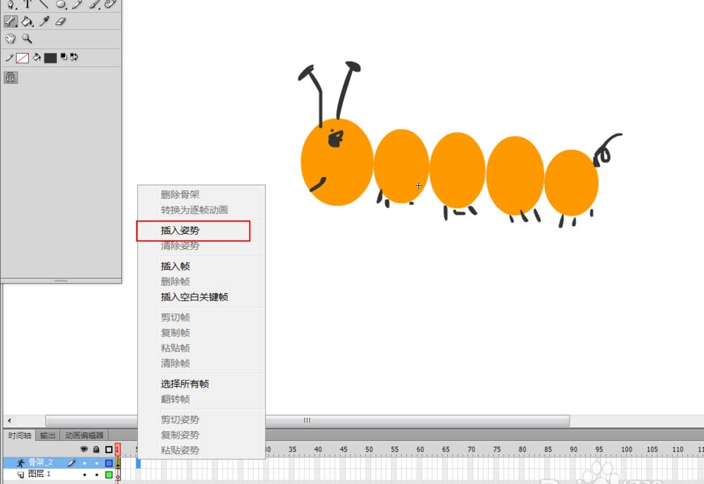 8、然后再分別在第10幀,第15幀上右擊選擇“插入姿勢”,繼續改變調整毛毛蟲的姿勢