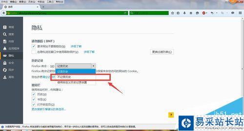 5、然后點(diǎn)擊下面的歷史記錄——Firefox將會(huì)后面的下拉菜單,打開(kāi),找到不記錄歷史選項(xiàng)。