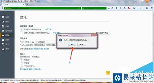 6、選擇不記錄歷史,然后火狐會(huì)有彈窗提示必須重啟瀏覽器才能啟動(dòng)這個(gè)功能,選擇確定。重啟瀏覽器即可。