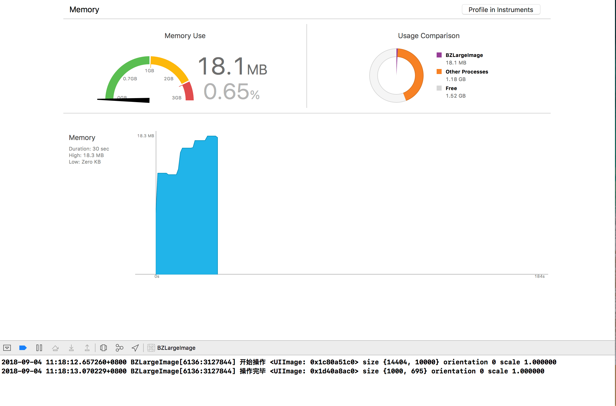 通過圖上可以看出,在進行圖片縮放的時候,內(nèi)存有小幅增加,產(chǎn)生的消耗在18M,耗時也在1.5s左右。