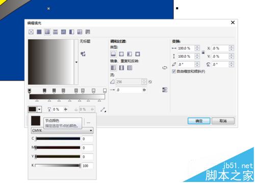 7、把漸變點如下圖排列,同第六步原理,將兩邊的漸變點填充成黑色C0 M0 Y0 K 100 中間的漸變點填充為C0 M0 Y0 K30,這樣高光的效果就出來了。然后點擊確認。