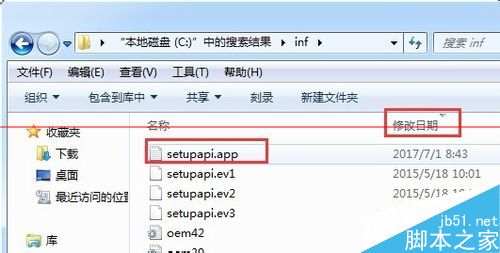 9、首先,打開inf文件夾,點擊修改日期進行排列,我們看到“setupapi.app”文件為2017/7/1。進行刪除。