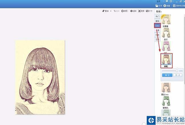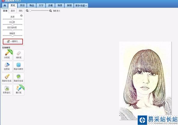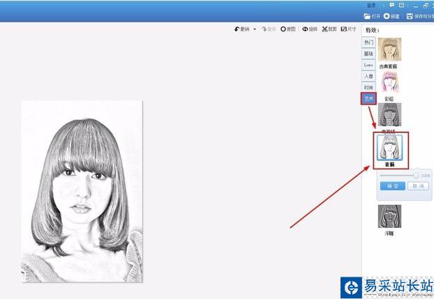 2、進(jìn)入“美化”菜單下,選擇“熱門特效”里的“素描特效”,一鍵速成相當(dāng)簡單。