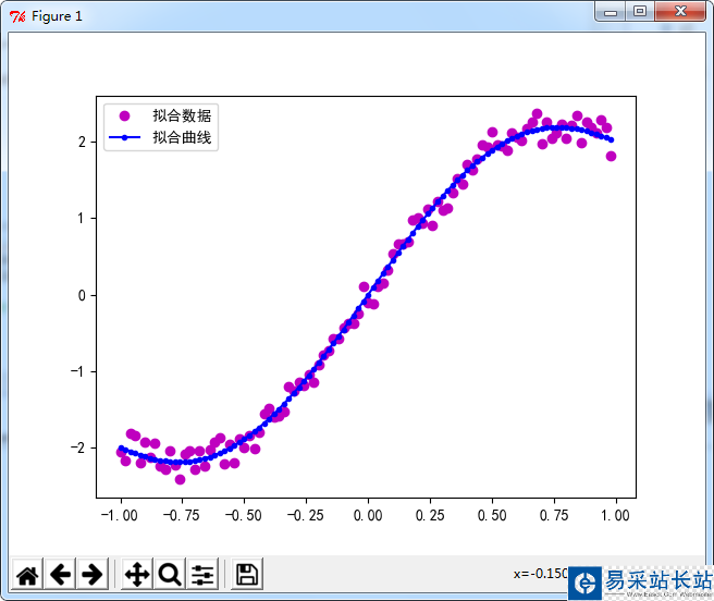 # -*- coding: utf-8 -*-#! python2import numpy as np import matplotlib.pyplot as plt from pylab import mplmpl.rcParams['font.sans-serif'] = ['SimHei'] # 指定默認字體plt.rcParams['axes.unicode_minus']=False #解決負數坐標顯示問題 #x的個數決定了樣本量x = np.arange(-1,1,0.02) #y為理想函數 y = 2*np.sin(x*2.3)+0.5*x**3#y1為離散的擬合數據y1 = y+0.5*(np.random.rand(len(x))-0.5)z1 = np.polyfit(x, y, 6)# 生成多項式對象p1 = np.poly1d(z1)pp1=p1(x)###################################plt.plot(x,y,color='g',linestyle='-',marker='',label=u'理想曲線') plt.plot(x,y1,color='m',linestyle='',marker='o',label=u'擬合數據')plt.plot(x,pp1,color='b',linestyle='-',marker='.',label=u"擬合曲線") # 把擬合的曲線在這里畫出來plt.legend(loc='upper left')plt.show()