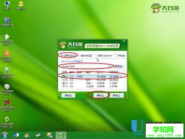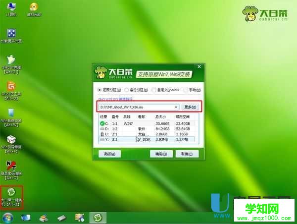 我們直接打開桌面上的大白菜一鍵裝機程序,然后出現的對話框里選擇還原分區,點擊更多選擇之前拷貝到U盤里的win7 iso鏡像,選擇自動提取gho文件,點擊下拉框,選擇.gho結尾的大文件;