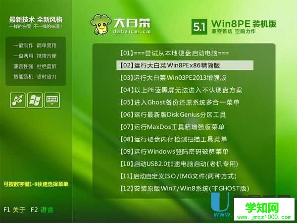 步驟四、然后就會從U盤啟動了,這時候會出現U盤的啟動界面,如下圖這樣的,我們選擇從winpe啟動,一般選擇win8pe,老電腦選項03pe。