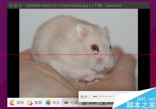 點擊下方工具欄上的紅眼按鈕,彈出紅眼消除浮動工具欄,同時照片上出現一個圓形選擇圈。我們用鼠標將圓圈拖動到紅眼所在位置,然后用浮動工具欄上的紅眼大小滑塊調整圓圈的大小。