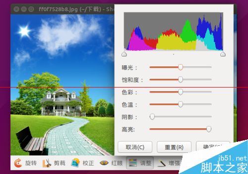 點擊下方工具欄上的調整按鈕,彈出色彩色度浮動工具欄,可以調整照片的曝光值、色彩飽和度、色調、色溫、陰影、亮度等參數。