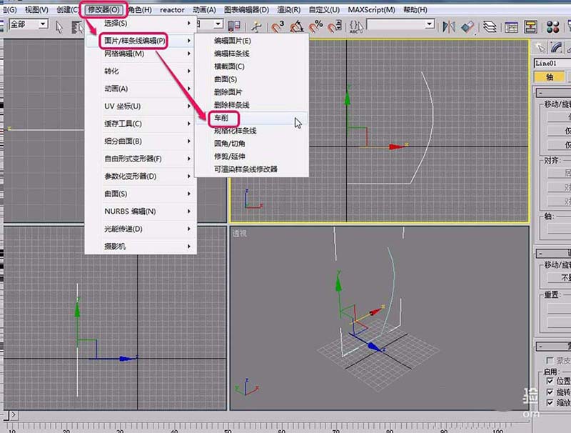 7、打開“修改器”菜單,選擇“面片/樣條線編輯”項中的“車削”命令。