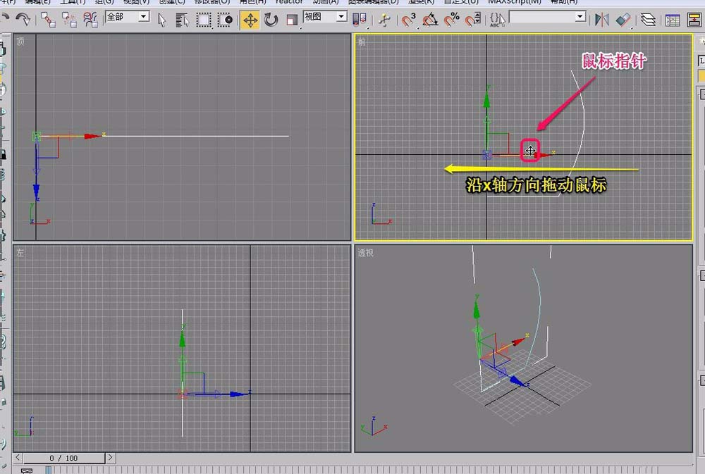 5、使用鼠標拖拽圖形的局部坐標沿著x軸移動一段距離,使得軸心和缸的截面的底部左邊界在z軸方向上在一體直線上。