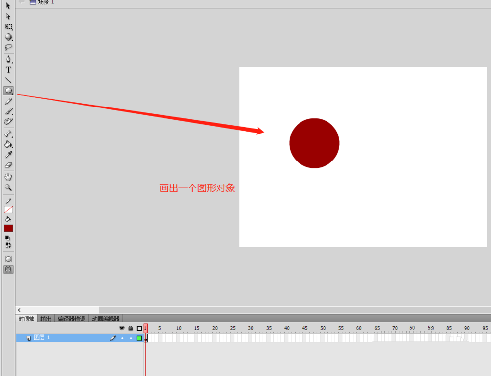 2、新建了flash動(dòng)畫項(xiàng)目之后,我們?cè)趂lash的舞臺(tái)上隨便使用圖形繪制工具繪制一個(gè)基本圖形出來(lái)。