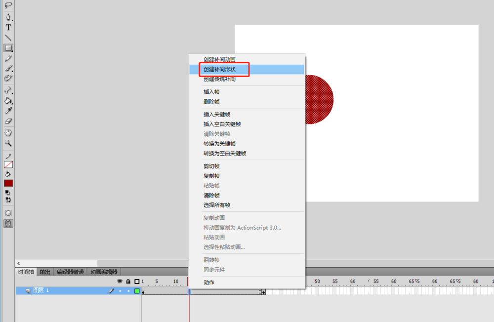 3、然后通過(guò)繪制的圖形在時(shí)間軸中來(lái)制作一個(gè)簡(jiǎn)單的補(bǔ)間形狀的flash動(dòng)畫