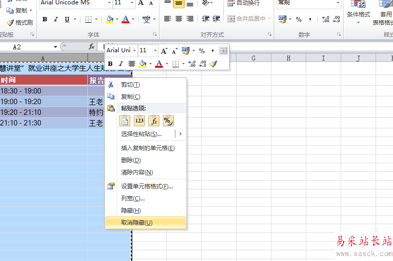 4、想要取消隱藏,就選中所有的內容,單擊右鍵,選擇取消隱藏。