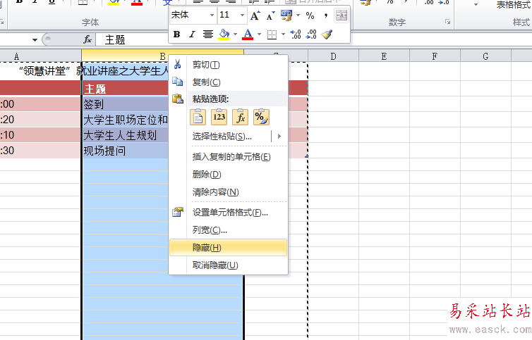 2、找到想要隱藏的數據,選中單擊右鍵,選擇隱藏。