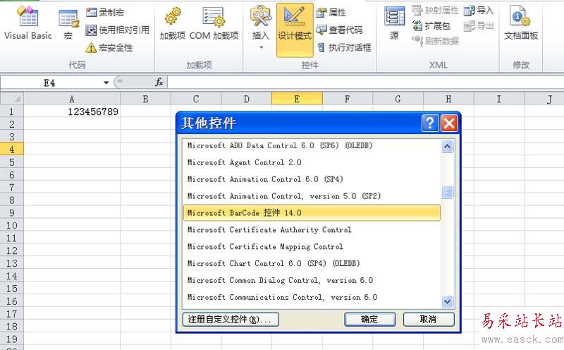 3、執行開發工具-插入命令,從下拉菜單中選擇其他控件選項,在彈出的其他控件對話框中選擇Microsoft barcode控件,點擊確定按鈕。