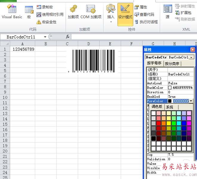7、這時我們就會看到條形碼下方的編碼變成了我們需要設置的編碼了,在屬性面板中可以修改其他屬性值,比方說前景色、背景色等等。