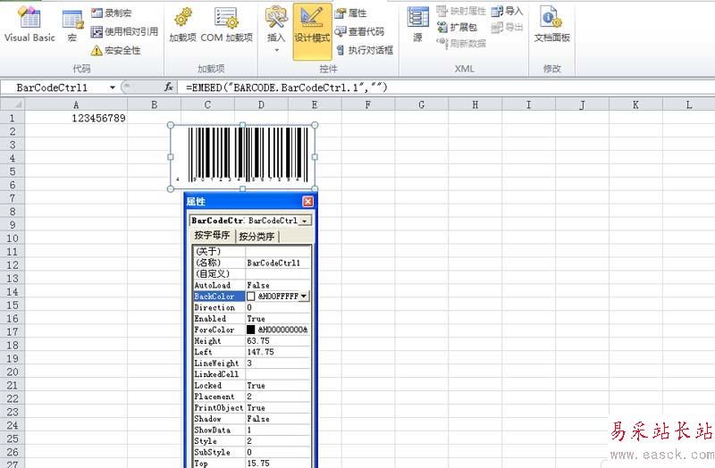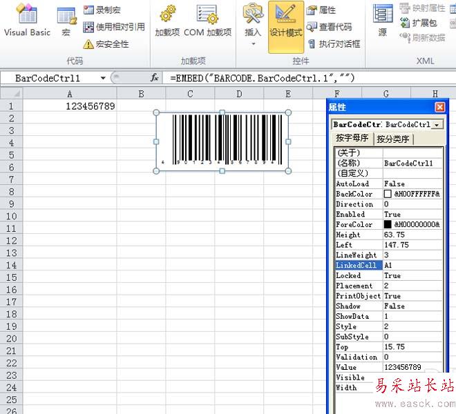 6、在屬性對話框中找到linkdecell屬性,設置屬性值為“a1”,因為我們a1里放置的就是要生成條形碼的編碼。