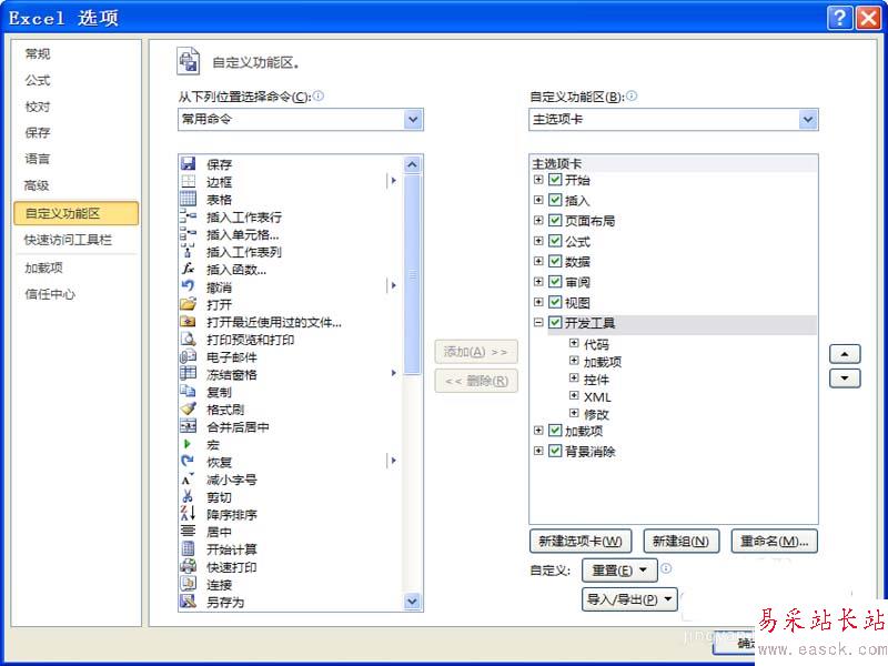 1、首先啟動excel2010,執行文件-選項命令,在彈出的對話框中選擇自定義工具欄,選擇右側的開發工具,點擊確定。