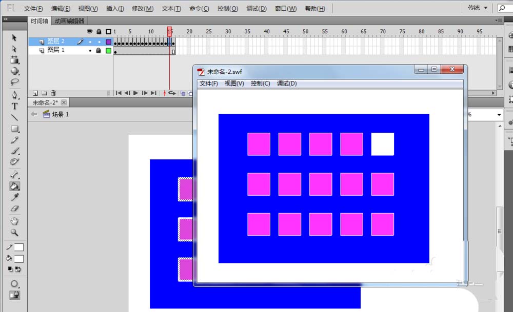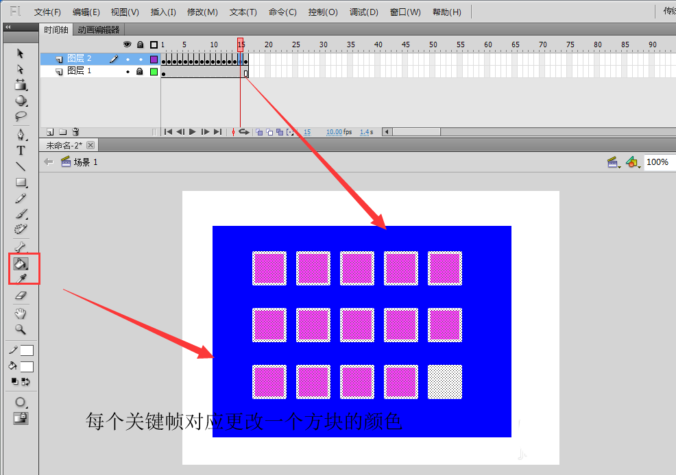 6、然后依次單擊選中圖層2的每一個(gè)關(guān)鍵幀,使用顏料桶工具對(duì)應(yīng)更改一個(gè)方塊的顏色。全部改完之后測(cè)試動(dòng)畫,就看到跑馬燈的流動(dòng)方塊逐幀動(dòng)畫效果了。