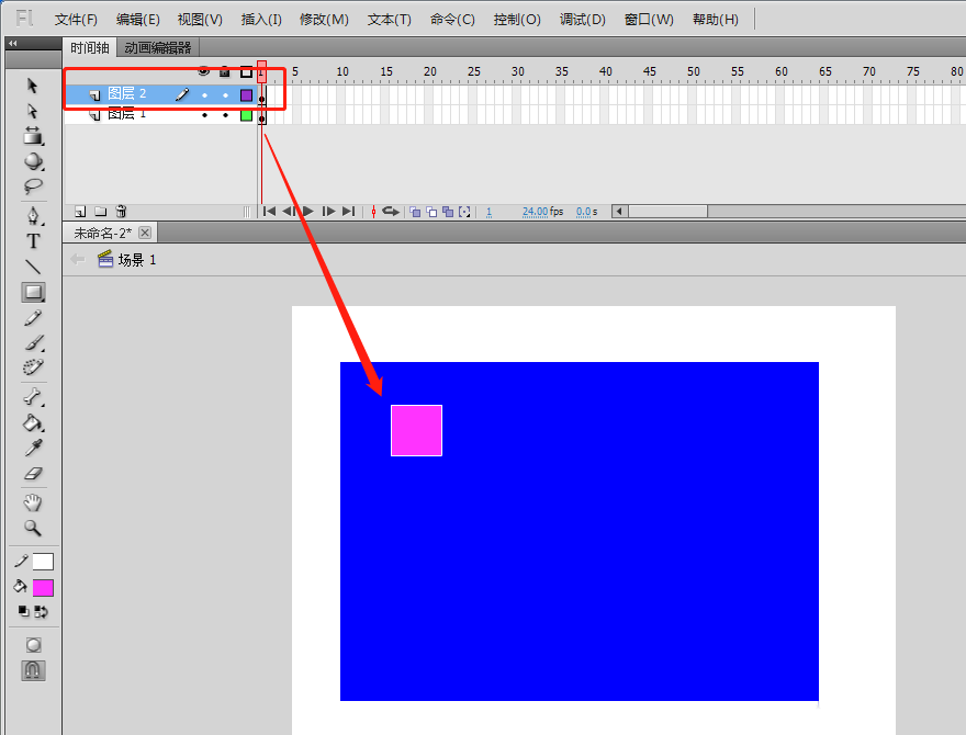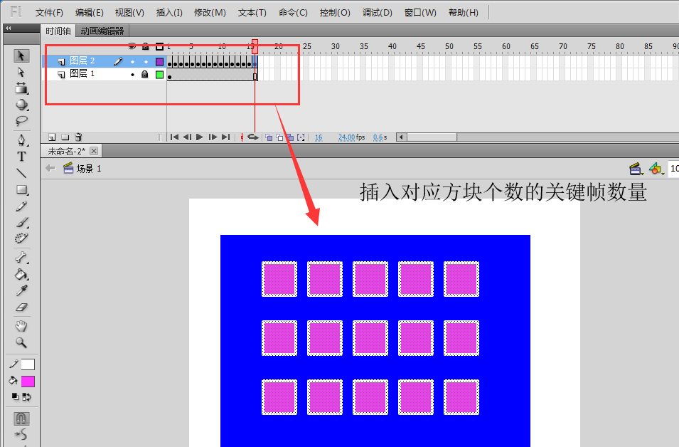 5、在圖層2上根據(jù)小方塊的個(gè)數(shù)多少插入相同數(shù)量的關(guān)鍵幀,并將圖層1的背景的時(shí)間軸延長(zhǎng)到相同長(zhǎng)度。