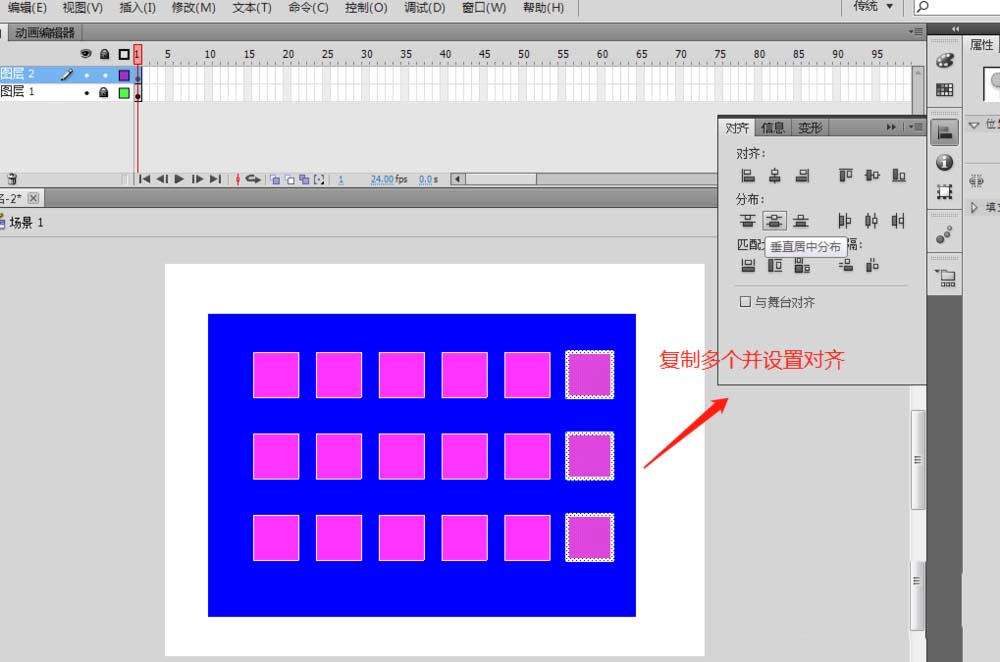 4、選中這個(gè)繪制的小方塊圖形進(jìn)行復(fù)制出來(lái)多個(gè),并在對(duì)齊面板中設(shè)置這些小方塊對(duì)齊分布。
