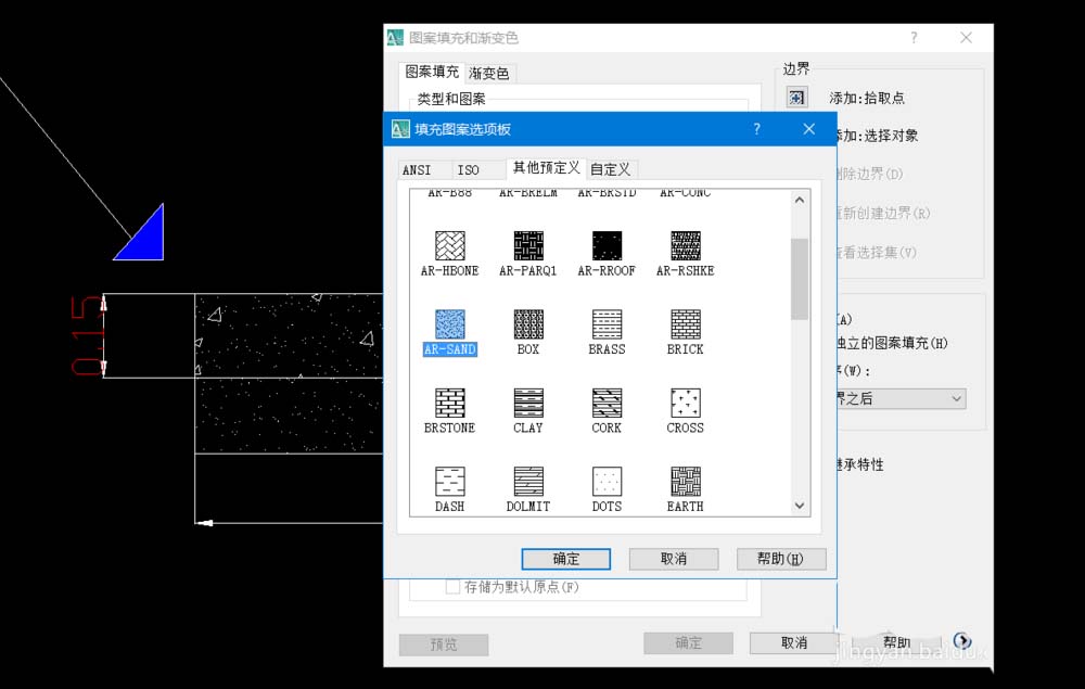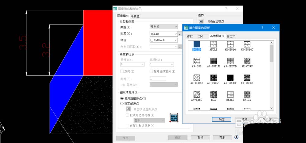 5、點擊繪圖工具欄中的“矩形”或直線按鈕,繪制底面正視圖形,標注長度和寬度,點擊背景按鈕選擇填充顏色,再選中邊界即可為底面正視圖形設置背景材料。