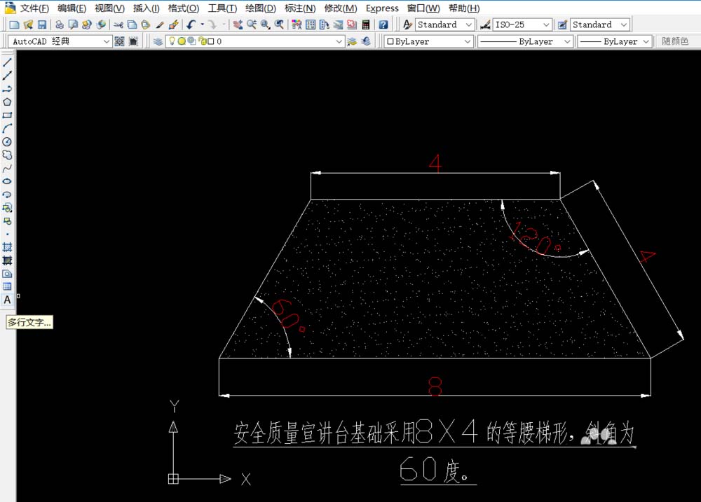 1、打開CAD,點擊繪圖工具欄中的“矩形”或直線按鈕,點擊“ 正交 ”按鈕,繪制等腰梯形,標注角度、上下底長及腰長。
