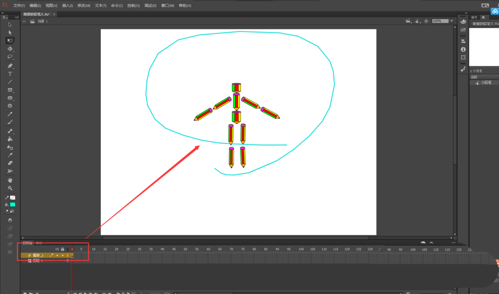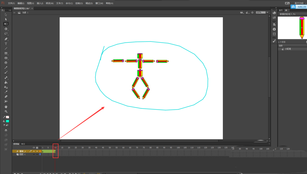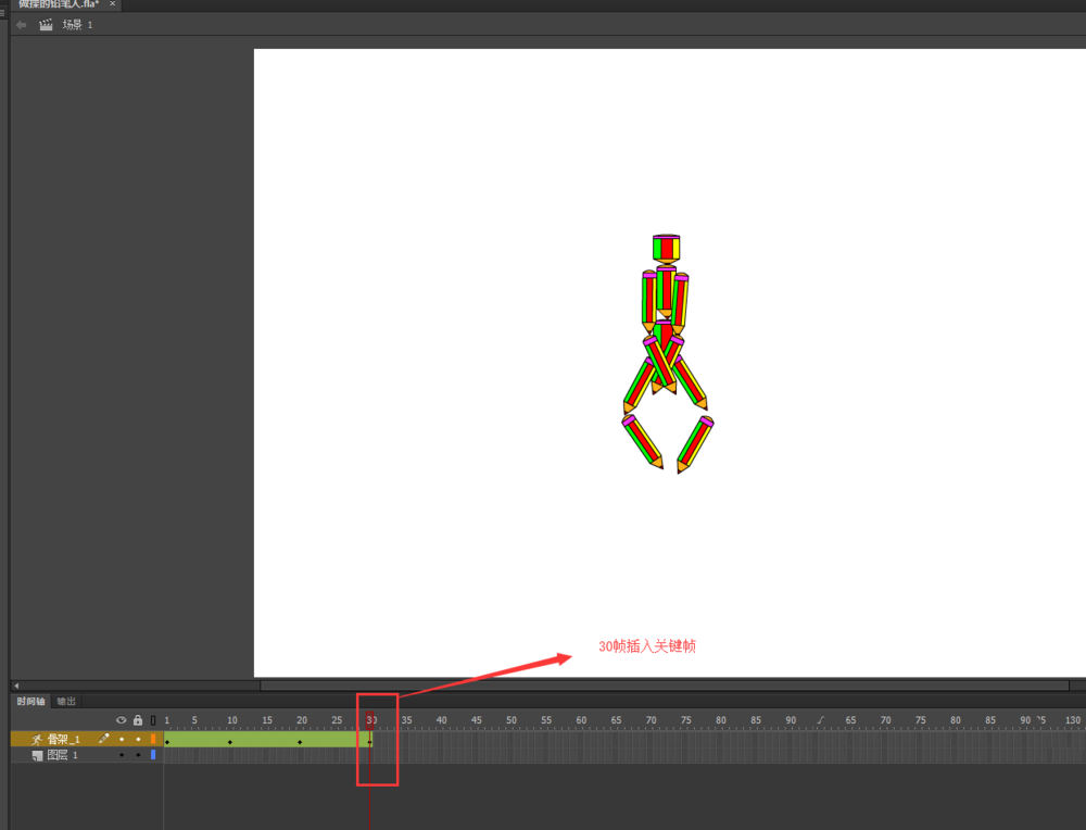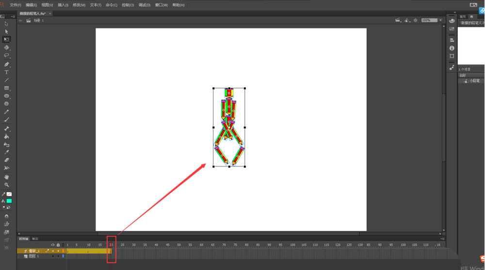 1、打開并新建一個flash動畫,將我們之前用骨骼工具連接的鉛筆人導入到flash場景中。