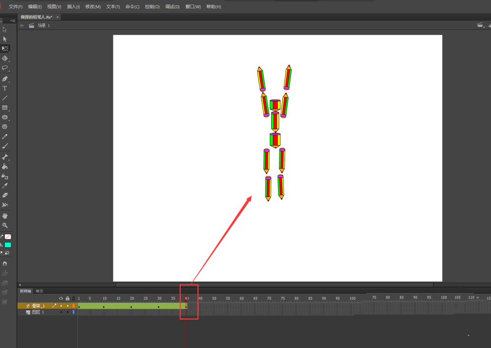 5、在第四十幀位置插入一個關鍵幀,然后將鉛筆人調整為直立站立,然后將鉛筆人的兩個胳膊往上進行調整。