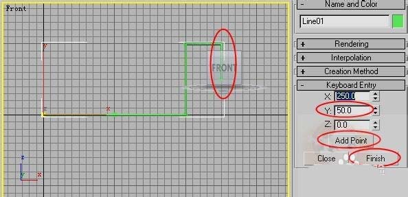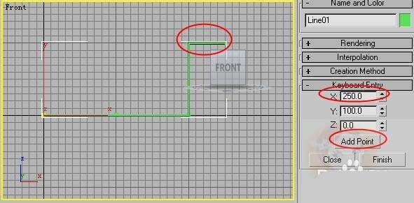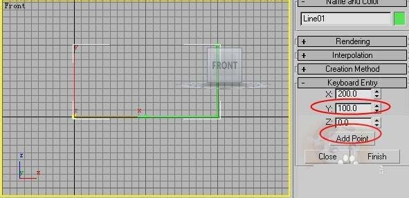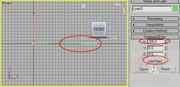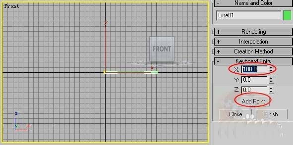 2、在X軸上輸入100個單位,單擊添加點按鈕如圖所示。(為了讓大家清楚,我已經(jīng)把線在渲染的卷展欄里設(shè)置粗了。)