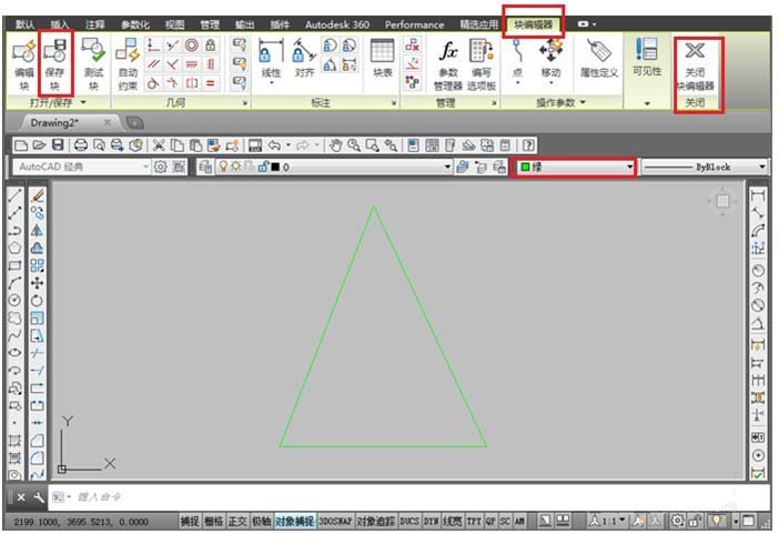 點擊【確定】,打開【塊編輯器】,設置“三角形”塊對象的線的顏色為綠色,點擊“保存塊”,然后【關閉塊編輯器】,如下圖所示: