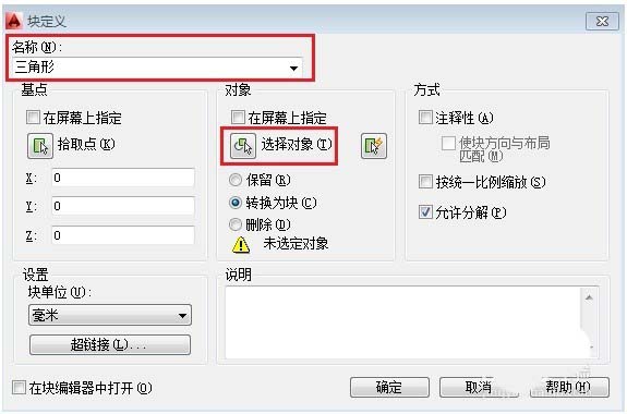 命令行:BLOCK或B,彈出【塊定義】對話框,,輸入塊名稱為【三角形】,然后點擊【選擇】對象,選擇剛才繪制的三角形圖層,如下圖所示:
