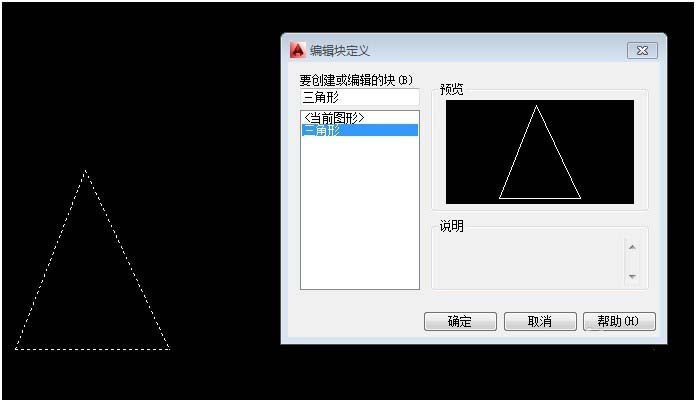 “三角形”塊創建完成,此“三角形”塊內的線條對象顏色的改變是隨塊改變的;雙擊“三角形”塊,打開【編輯塊定義】