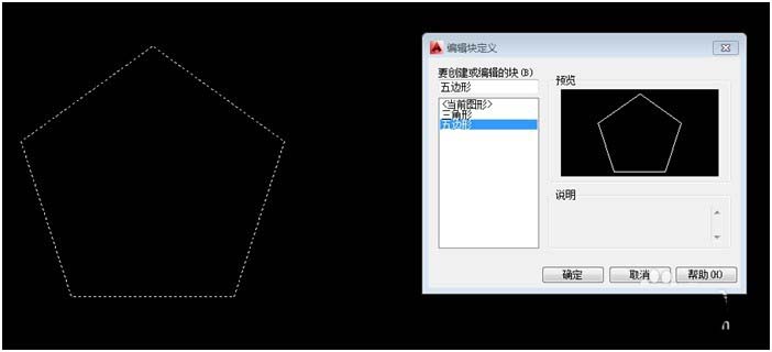 “五邊形”塊創建完成,此“五邊形”塊內的線條對象顏色的改變是隨層改變的;雙擊“五邊形”塊,打開【編輯塊定義】