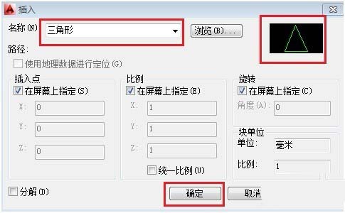 命令行:INSERT或I,彈出塊【插入】選項板,選擇【三角形】塊,然后點擊【確定】按鈕