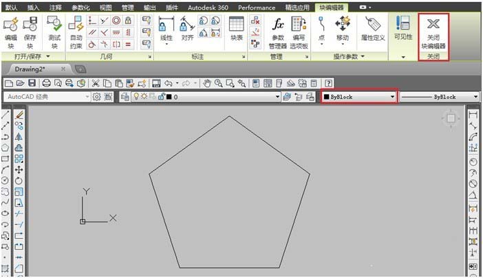 點擊【確定】,打開【塊編輯器】,發現“五邊形”塊對象的線的顏色已經設為ByLayer,【關閉塊編輯器】,如下圖所示: