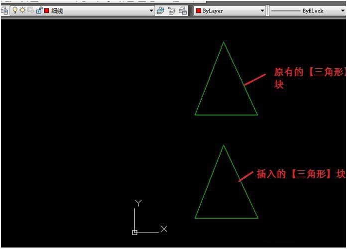 插入的“三角形”塊,如下圖所示,顏色為“綠色”,為剛才在【塊編輯器】時設置的顏色。
