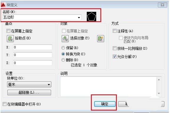 命令行:INSERT或I,彈出塊【插入】選項板,選擇【五邊形】塊,然后點擊【確定】按鈕