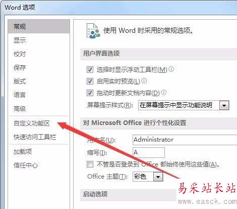 3、在打開的Word選項窗口中,點擊左側邊欄的“自定義功能區”快捷鏈接