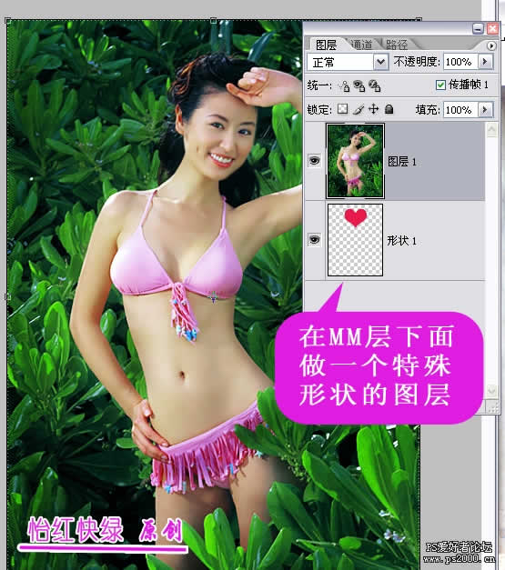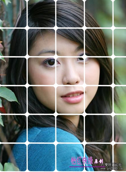 方法是:首先利用圓角矩形定義一個圖案,(具體方法不能細講了),在人物層下面新建一層,填充剛才定義的圖案,然后創建剪貼蒙版,就是這個效果。