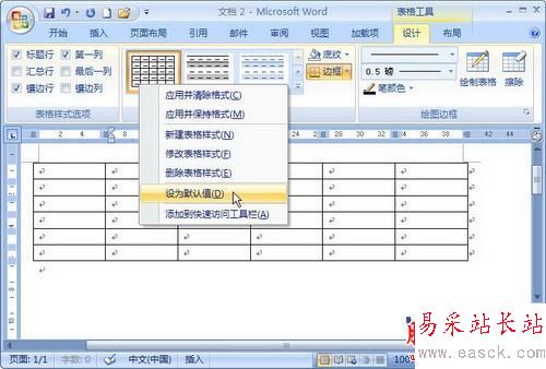 第1步,打開Word 2007文檔窗口,首先插入任意格式的表格。單擊新建的表格,在打開Word 2007“表格工具”功能區中切換到“設計”選項卡。然后在“表樣式”分組中右鍵單擊任意表格樣式,選擇“設為默認值”命令,如圖所示。