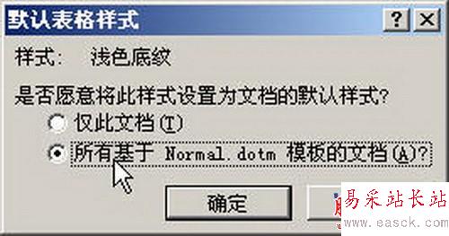 第2步,打開Word 2007“默認表格樣式”對話框,選中“所有基于Normal.dotm模板的文檔”復選框,并單擊“確定”按鈕,如圖所示。