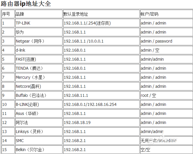 十五大常用品牌路由器地址和帳戶密碼圖表 ... [更多詳細]