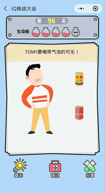 微信IQ挑戰大會第98關【TOMY要喝帶氣泡的可樂】答案攻略 ... [更多詳細]
