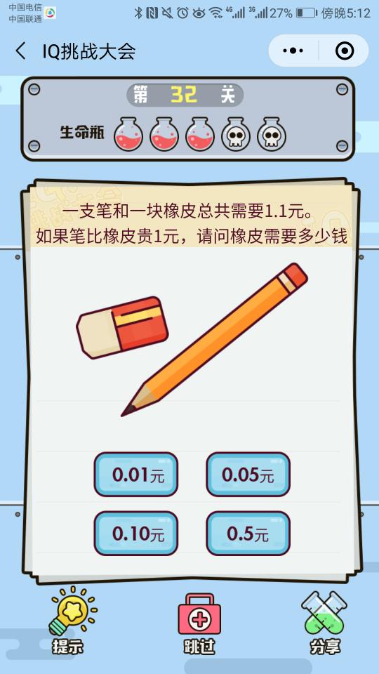 微信IQ挑戰大會第32關【請問橡皮需要多少錢】答案攻略 ... [更多詳細]