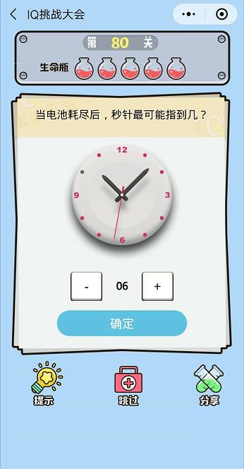 微信IQ挑戰大會第80關【當電池耗盡后秒針最可能指到幾】答案攻略 ... [更多詳細]