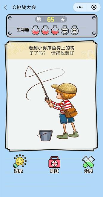 微信IQ挑戰(zhàn)大會第65關(guān)【看到小男孩魚鉤上的鉤子了嗎請幫他裝好】答案攻略 ... [更多詳細]