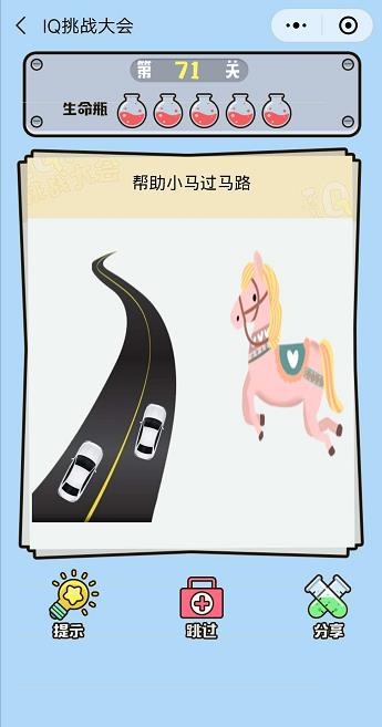 微信IQ挑戰(zhàn)大會第71關(guān)【幫助小馬過馬路】答案攻略 ... [更多詳細]